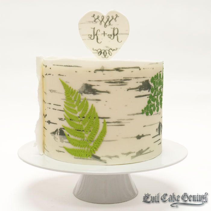 Set of 2 Acrylic Stencils. Fern Pair Stencil measures approximately 6-3/8" wide by 6" tall. Large individual fern leaf measures 4-5/8" wide by 5-1/8" tall. Small individual fern leaf measures 3-1/4" wide by 5" tall. Stenciling photo tutorial included. Shown on background fondant stenciled with our Birch Pattern Mesh Stencil for a little added Awesome!