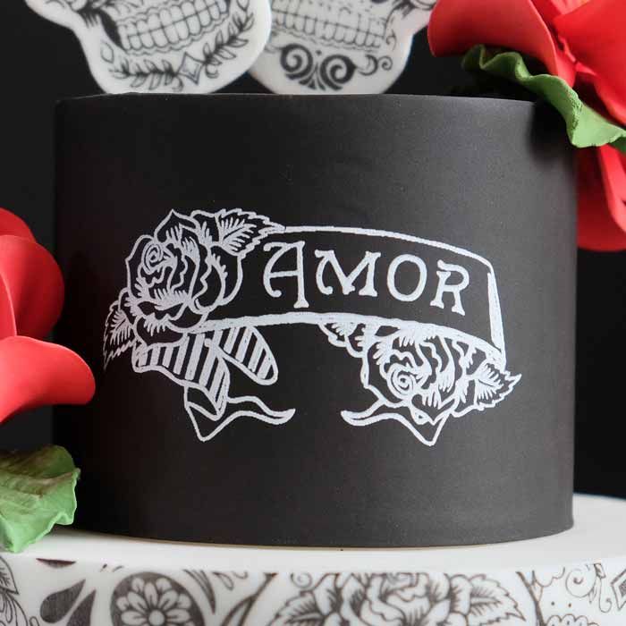 Fabulous vintage banner and rose patterns makes a great tattoo inspired or Day of the Dead-look tier or toppers. Set of two different designs. Patterns can be colored in with Petal Dust Colors mixed with cooking oil or with our Food Color Pens Patterns makes a great Chalk Board Art pattern if done in white over black as well! Select Spanish, English or Blank to fill in your own text. Birthday/Feliz Cumpleanos banner measures 4-1/4" x 2-3/4" tall, Amore or Love banner measures 4-1/2" x 2-1/8" tall.