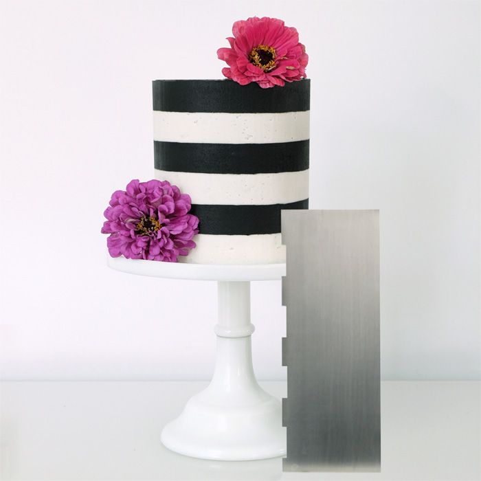 Make Multi Colored Stripes on Buttercream, Ganache, and Royal Icing frosted cakes in no time! Simply frost the cake, smooth the frosting with the straight side of the comb, then flip the comb over to the toothy stripe side and comb out perfectly horizontal stripes. Refrigerate the cake until solid, fill in with whatever color stripes you'd like, and flip back to the straight edge of the comb to gradually scrape away the excess icing until perfect two (or more) toned stripes emerge!
